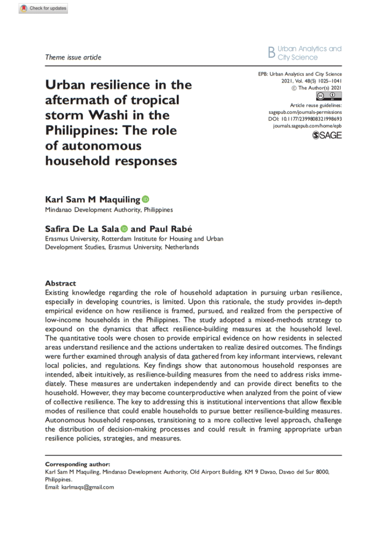 Urban resilience in the aftermath of tropical storm Washi in the Philippines: The role of autonomous household responses